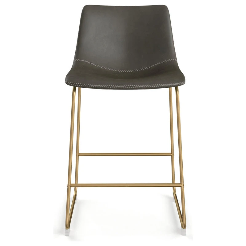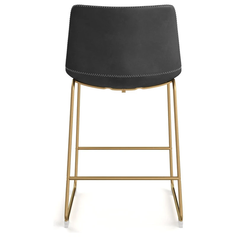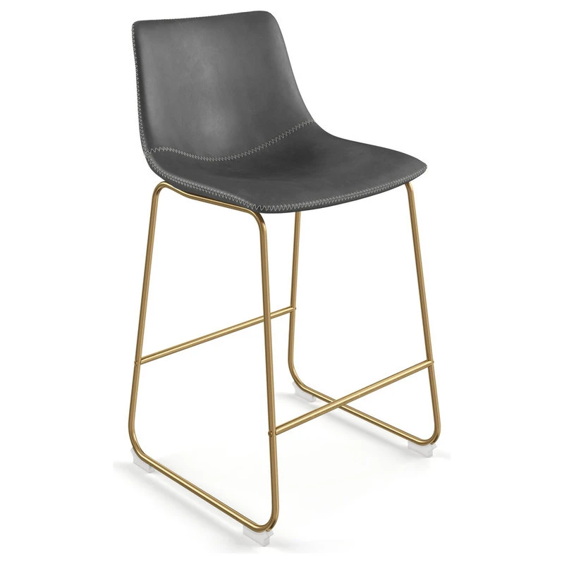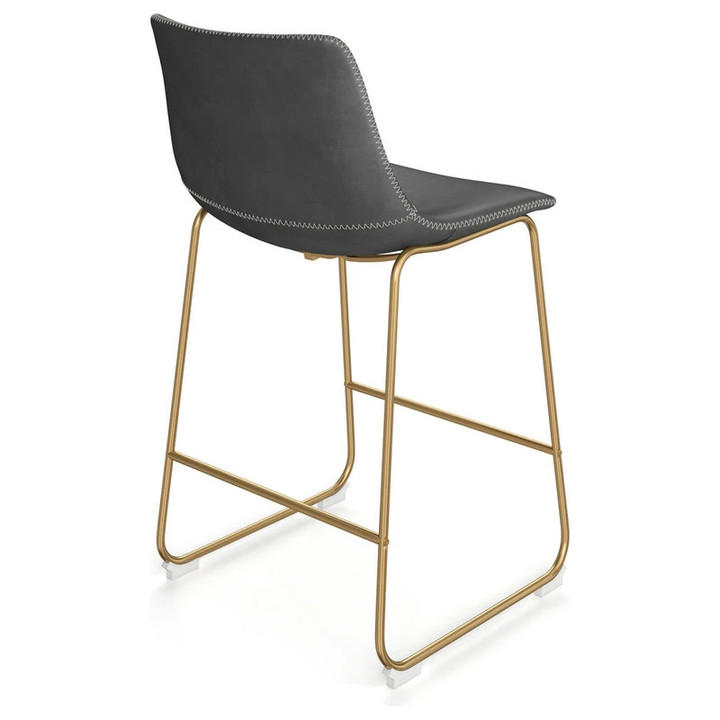 Converging style and functionality, these counter stools embody a vintage flare with a truly modern touch that is sure to please. The faux leather padded seat perfectly meets the curvature of your back providing comfort and support while the contrasting zig-zag stitching conveys an undeniable decorative element. The sled base is constructed from sturdy metal in your choice of gold or black matte powder coated finish with an added perch to rest your feet. Non-marking caps have been added to protect your floors. Stools are sold in increments of two per carton.