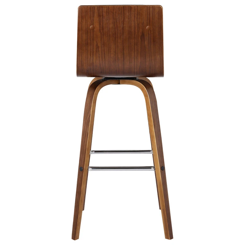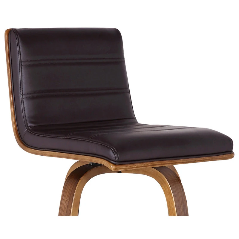 The Vienna 26″ Swivel Brown Faux Leather and Walnut Wood Counter Stool by Armen Living provides both versatile style and comfort with a Mid-Century Modern design that can easily be integrated into your home’s current d�cor. The 360-degree swivel function provides optimal mobility so you and your guests to stay engaged regardless of your place in the room at parties and gatherings. The Vienna�s frame is constructed of strong wood that is brilliantly accented by the plush high-density foam cushion that�s wrapped in faux leather upholstery. A square metal footrest is added for a chic and stylish aesthetic without comprising practicality and functionality of this item. The soft faux leather upholstery makes clean up a breeze, making this the perfect bar or counter stool for any entertaining home! With multiple bar seat height options and the armless design, you can easily pull the Vienna up to your kitchen island, peninsula counter, or home bar. The high seat back ergonomic properties to keep your back healthy and properly aligned. The Vienna is an ideal addition to any home or apartment and its quality materials ensure a comfortable seat for many years to come. The Vienna Counter or Bar Stool is available in 26� or 30� seat height and comes in your choice of a walnut wood finish with cream, grey, or brown faux leather or a black wood finish with grey faux leather.