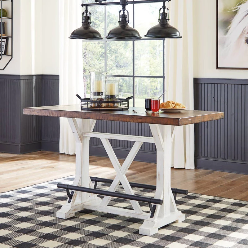 A high-style choice for smaller spaces, the Valebeck counter-height dining table serves up the best in rustic farmhouse living. Two-tone finish pairs a brown tabletop with a distressed vintage white base for a double helping of charm. Black metal foot rests add such a distinctive twist.