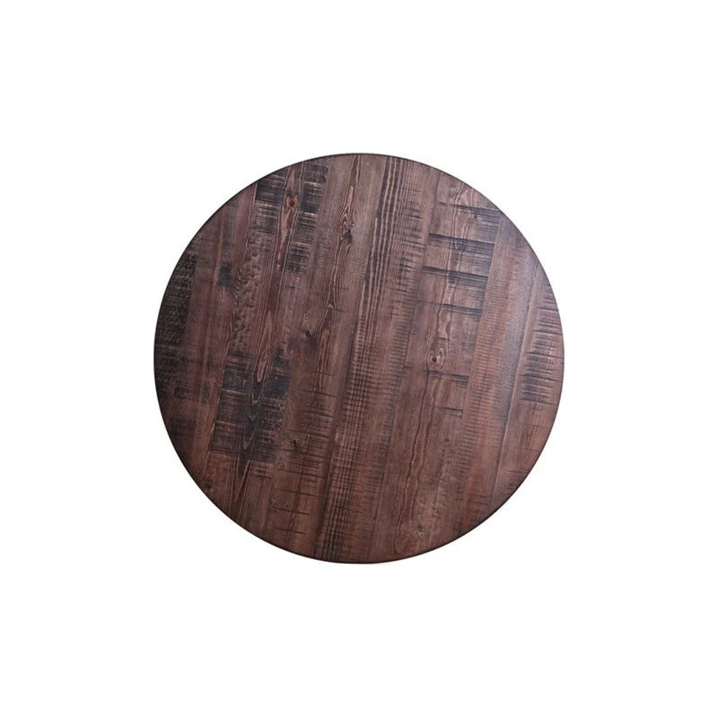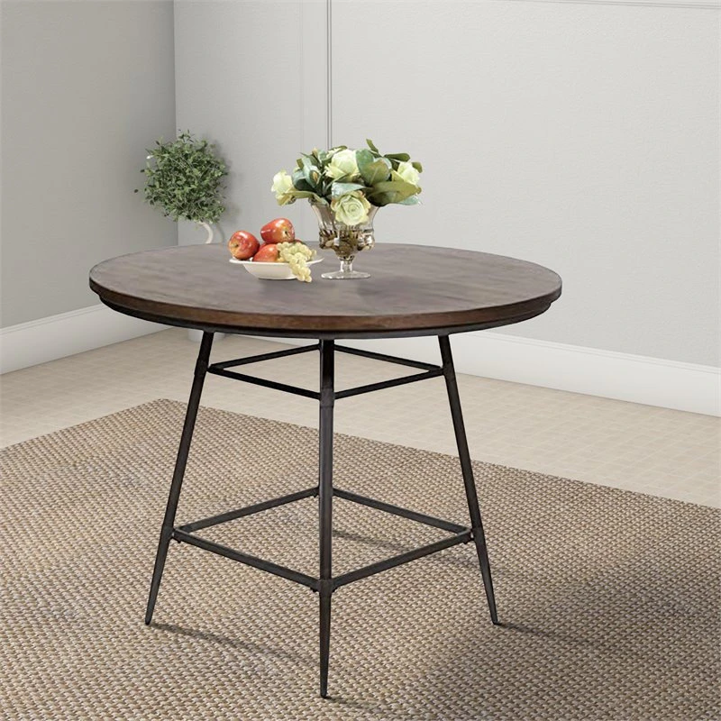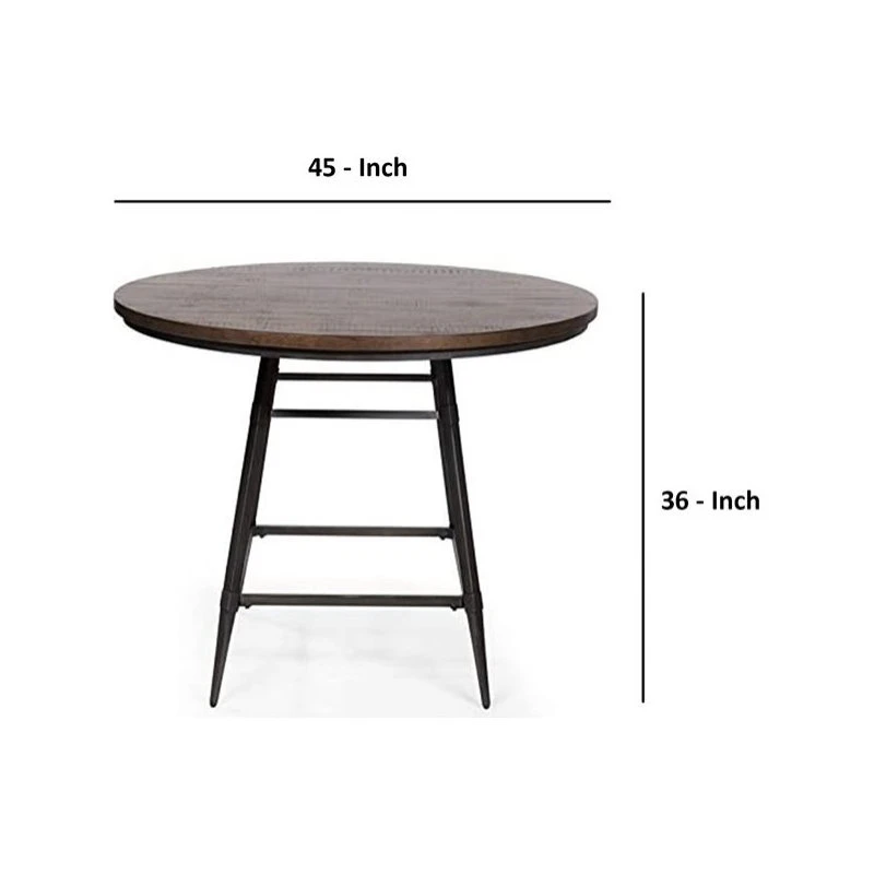 Bring home this industrial style counter table which comes with a round dining top and showcases grain details. Constructed from the amalgamation of solid wood, veneer and metal, it is accented with weathered brown and black finish.