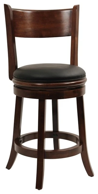 This beautifully constructed swivel stool is the perfect addition to your home. The attractively designed backrest plus the plush black seat, exuberates sophistication. The compatible design will undoubtedly merge seamlessly with any style kitchen, basement, game room, or bar! Constructed from solid hardwood, made with precision construction, and features a steel ball bearing swivel plate for a flawless three hundred and sixty degree swivel, making the Palmetto stool a durably solid piece of furniture. Performance tested by the leading testing facilities that are recognizable worldwide, purchasing this stool is not only a smart choice but also a wise investment. Additionally, the sleek bonded leather upholstery encases a high-density foam cushion providing the maximum level of comfort for all who sit.
