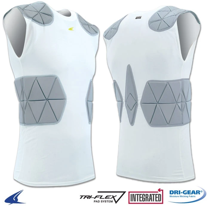Padded football compression shirt that has the Tri-Flex pad system that provides the ultimate combination of protection and flexibility. The Grip-Tech dots gives your shoulder pads traction and prevents slippage. The shirt is made of Champro Dri-Gear technology material that provides for a light weight cool shirt that fits great, durable and keeps the player cool.