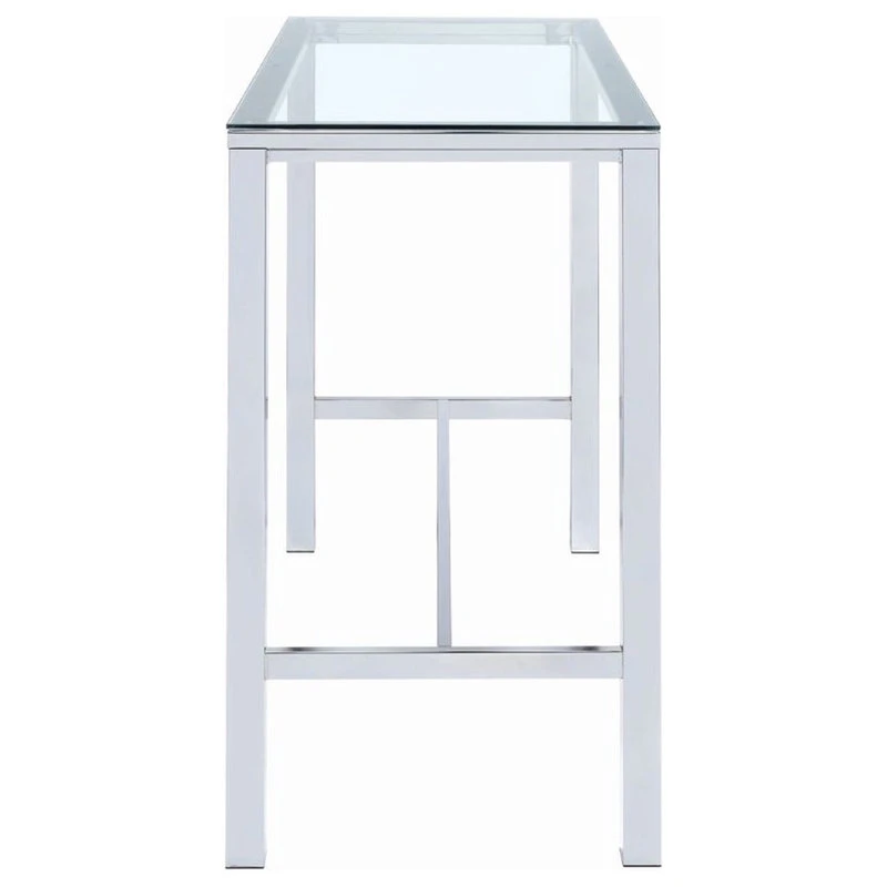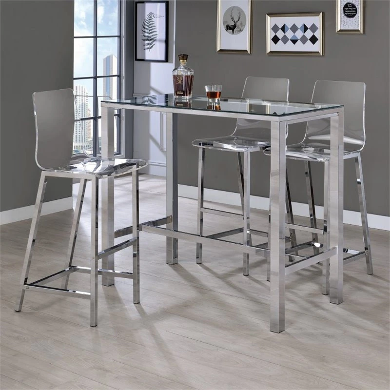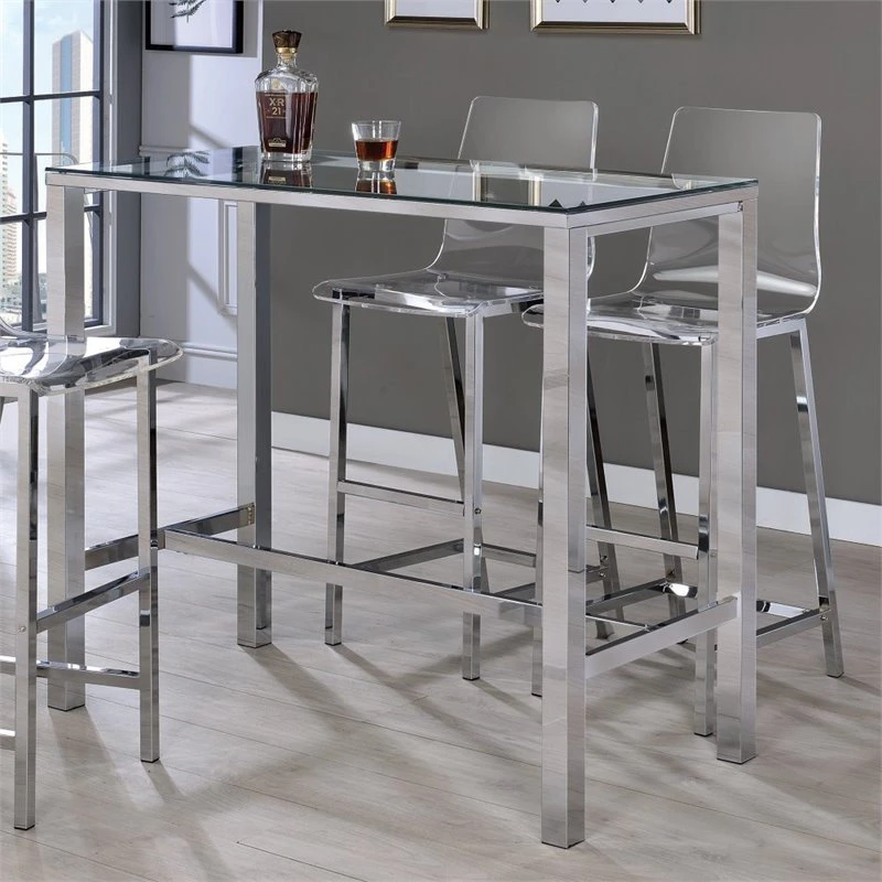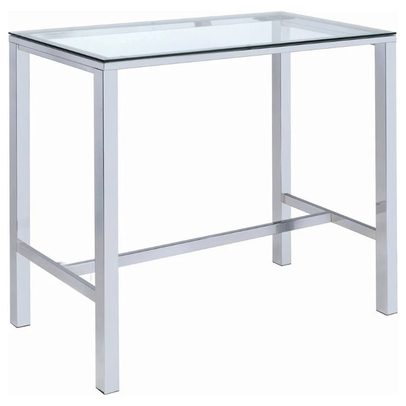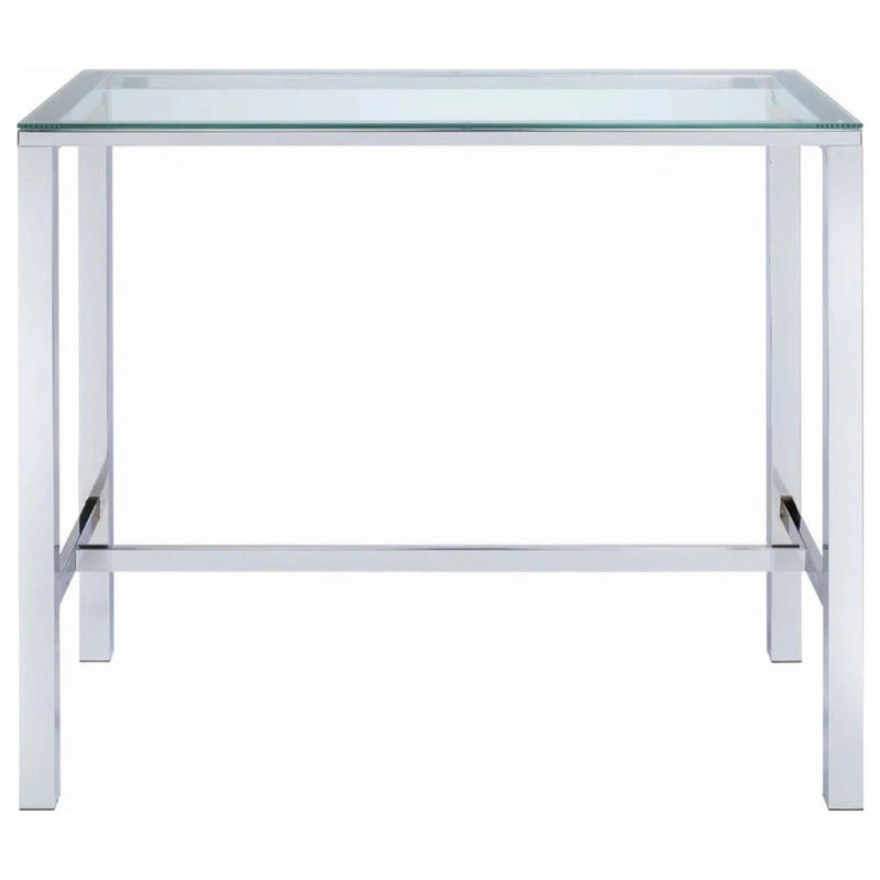 Add a flash of panache to your rec room or home bar with this modern bar table. Contemporarily designed with chrome legs and glass top. Crisp, clean lines cut an incisive silhouette. A martini with an olive or a classic old fashioned both deserve a bar table like this. Calculate your next investment or discuss your impending joint venture in style.
