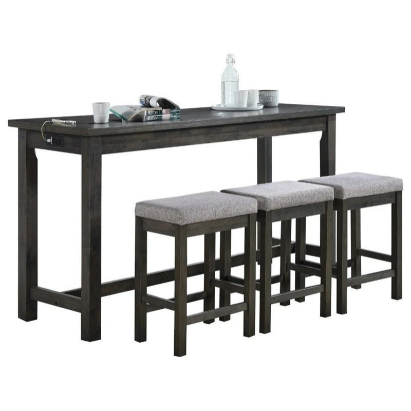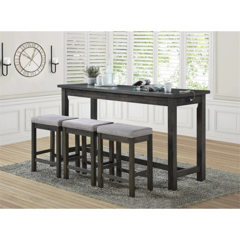 The elevated dining experience that the Connected Collection provides will fuel your device’s battery life while you fuel yourself. The convenience of built-in USB ports and A/C power turns your casual dining area into an efficient recharging station. The four-piece pack of the Connected Collection includes a counter height table and three barstools. A single drawer allows for discrete storage on the table’s side apron. As a neutral pallet for your decorative preference, the collection features a brownish grey finish over ash veneer, with the neutral gray tone of the barstool’s seats providing subtle accent.