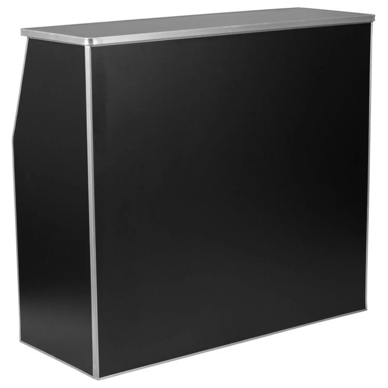 Take the party anywhere with this black laminate portable, folding bar table. A portable bar is a must for any traveling event coordinator. With two surfaces, this design provides a perfect space for prep and presentation and the shelf holds up to 50 lbs. Perfect for hotels, conventions, conferences, weddings, outdoor events and in house. They need relatively little storage space when they’re not in use. Remove the top, unhinge table and sides fold inward. They come out of storage and convert for use in minutes.