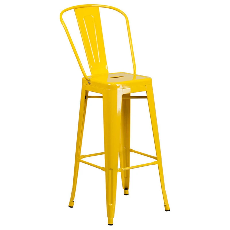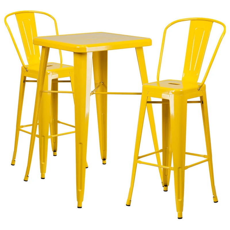 Complete your dining room, restaurant or patio with this chic bar table and chair set. This colorful set will add a retro-modern look to your home or eatery. The table top features an engraved designer print, stabilizing cross brace and protective rubber floor glides. The stylish bistro style barstools features a curved, vertical slat back. This 3 piece table set is designed for indoor and outdoor settings. For longevity, care should be taken to protect from long periods of wet weather. The possibilities are endless with the multitude of environments in which you can use this table, for both commercial and residential spaces. [CH-31330B-2-30GB-YL-GG].