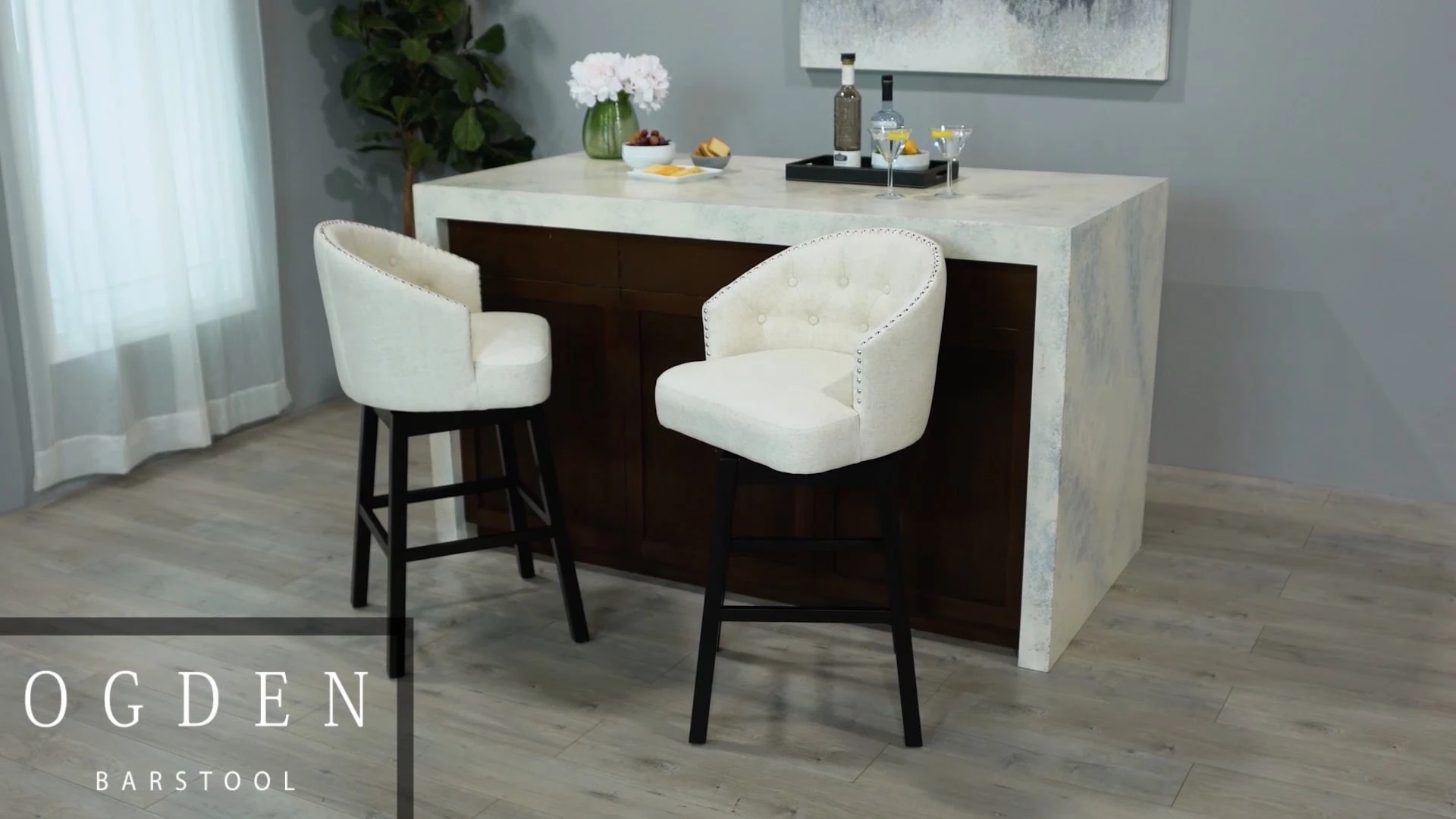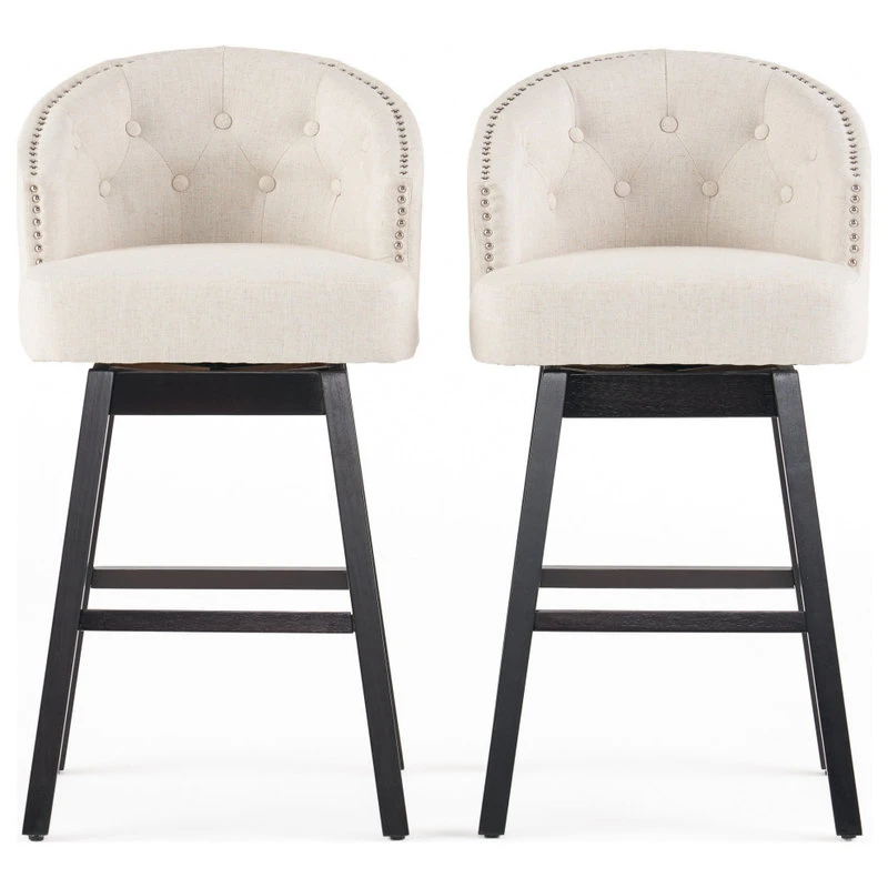 These comfortably soft barstools are a perfect transitional piece from your kitchen to your living room. Refined with a stunning nailhead trim and beautiful button-tufted seating, each barstool creates an exquisite contemporary appeal that brings incredible function to your kitchen nook or home bar. Our barstool set is complemented by a smooth rubberwood frame, creating a durable structure that ensures stability for you and your guests. Finished with a convenient 360-degree swivel function, this barstool offers a sophisticated design that enhances the style of any home.