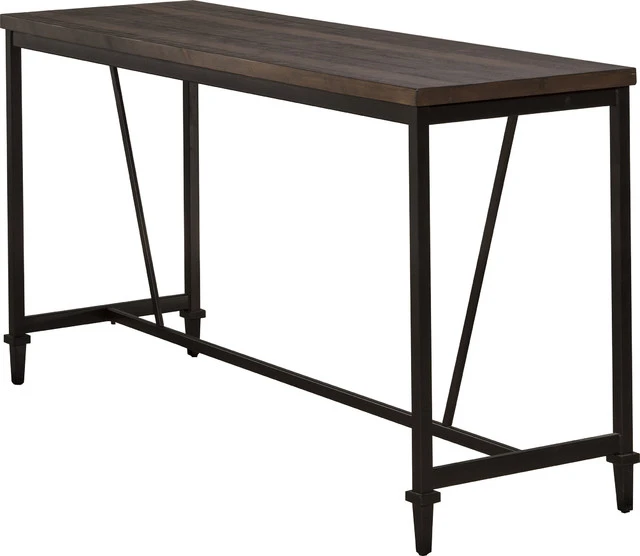 Bring that trendy bar atmosphere home with you with the stylish Trevino counter height bar table. Long, narrow and standing at the preferred counter height, the Trevino table boasts a distressed walnut-finished wood table top and brown metallic base.