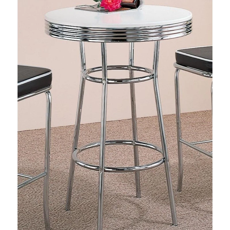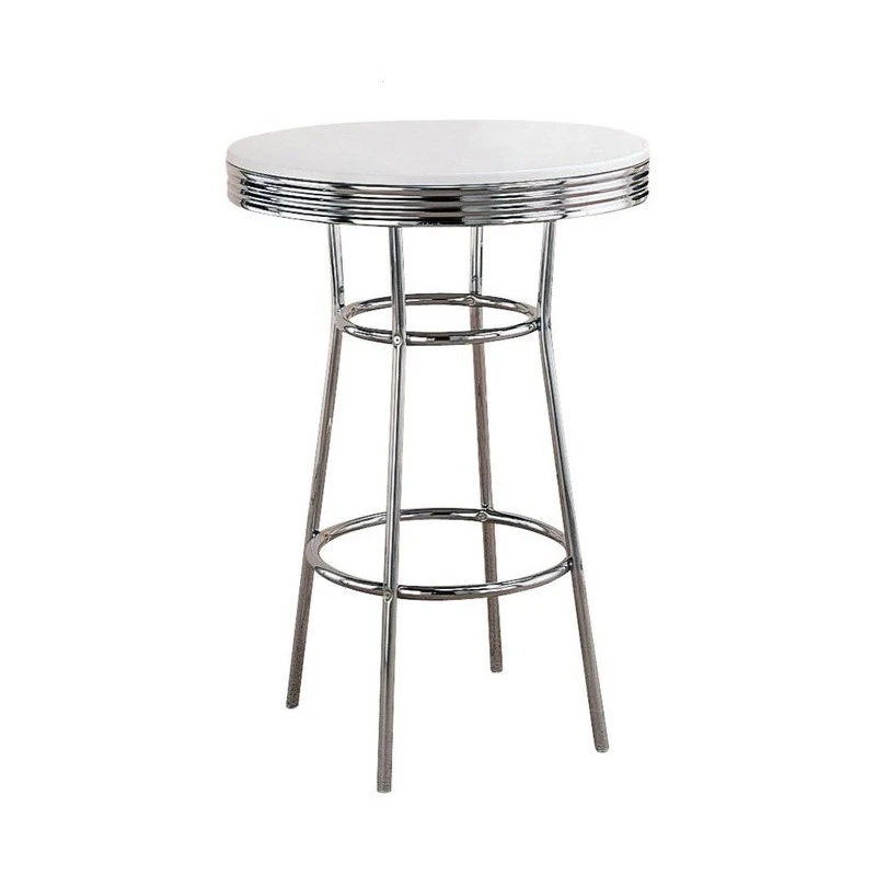 SKU: 2300_UB9 Category: Pub & Bistro Tables Tags: Bar table, Chrome bar table, Indoor bar tables, Indoor pub and bistro tables, Retro bar table, Retro pub table, Retro Soda Fountain Bar Table by Coaster, Soda fountain table
