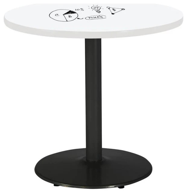 The T30RD is a 30″ round pedestal table. It has a 1.25″ thick high pressure laminate whiteboard top that’s durable and easy to clean. The top has an attractive edge that won’t crack or peel. The solid cast iron round base has levelling glides to prevent the table from wobbling on uneven floors. The steel has a 3″ diameter and is made of 16 gauge steel. Table is 29″ in Height. The top and base are all shipped in one box. Easy to assemble. Made in USA