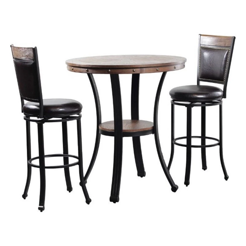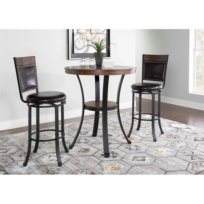 Mixing metal with wood, the transitional Franklin 3-Piece Pub Set provides a unique addition to your home. The round pub table features an oak wood grain veneer with nailheads along the apron. The sturdy metal base is made of curved legs and includes a small circular shelf. The matching stools feature a curved back with a dark brown faux leather back and seat with nailhead trim.