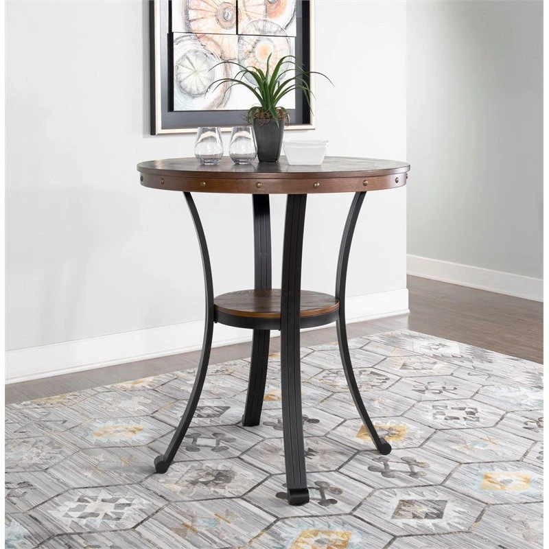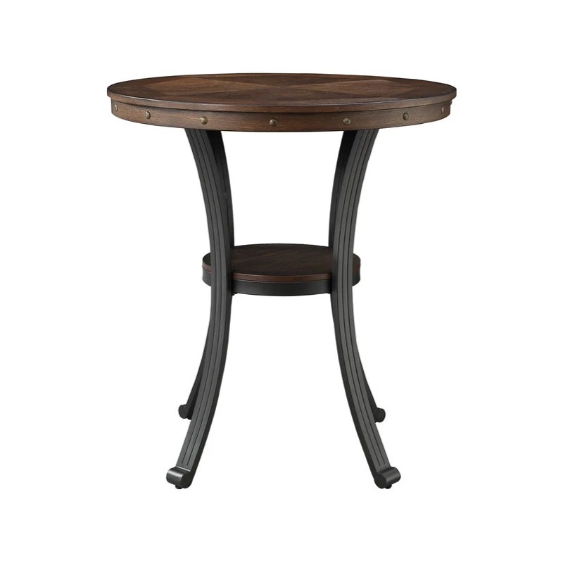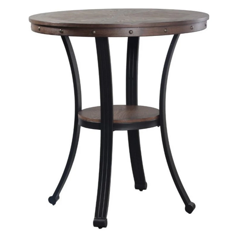 Mixing metal with wood, the transitional Franklin Pub Table provides a unique addition to your home. The round pub table features an oak wood grain veneer with nailheads along the apron. The sturdy metal base is made of curved legs and includes a small circular shelf.