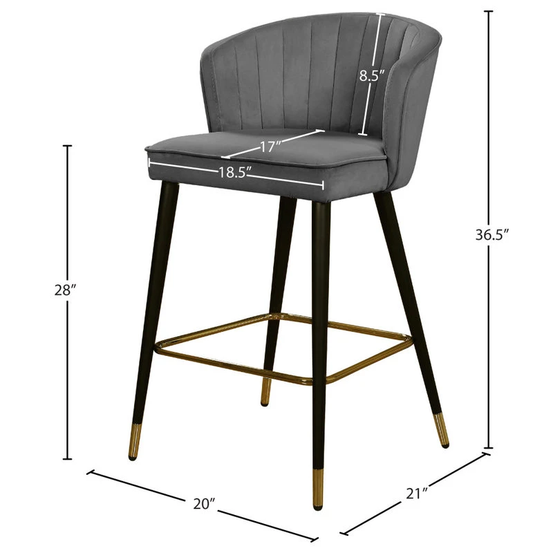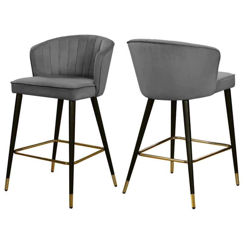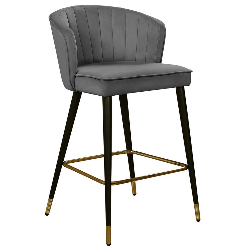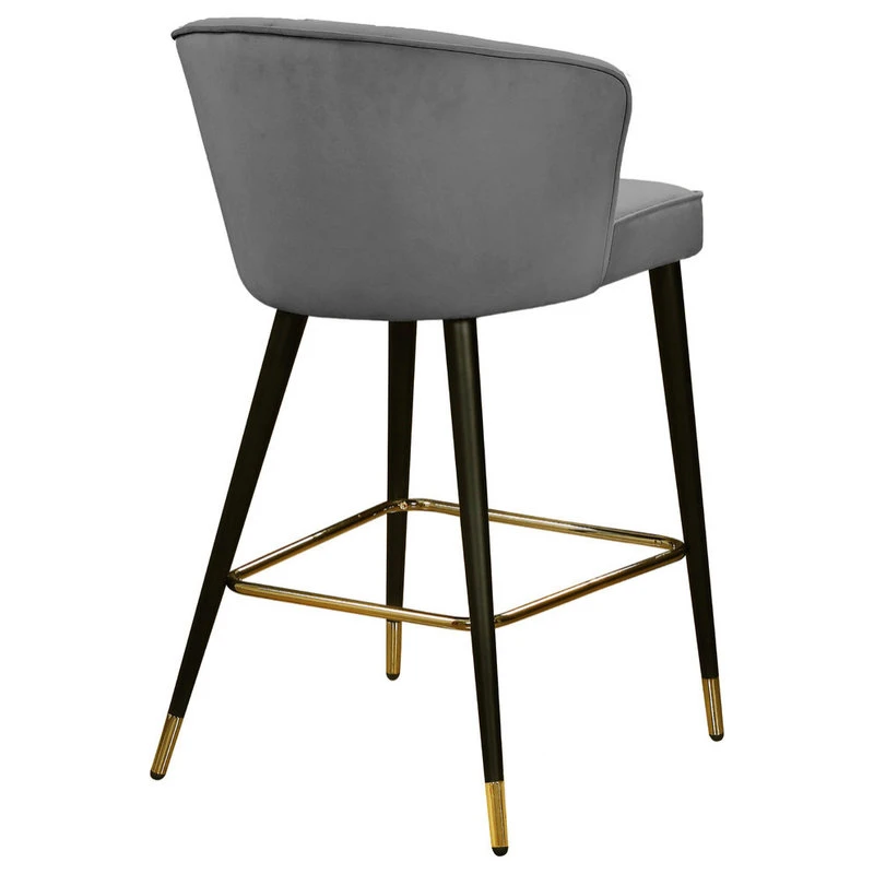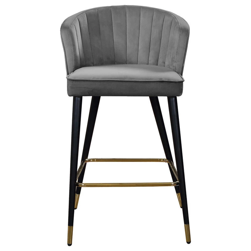 Give your kitchen counter a fresh new look with this Cassie Grey Velvet Stool. The shell-shaped back and channel tufted design draw the eye, making this stool an attention-commanding addition to your space. The sleek black metal legs flare slightly to create a modish silhouette, while goldtone tips on the ends and a goldtone foot rail complete the look. Rich velvet in a neutral hue makes it easy to blend this stool in easily with any color scheme.