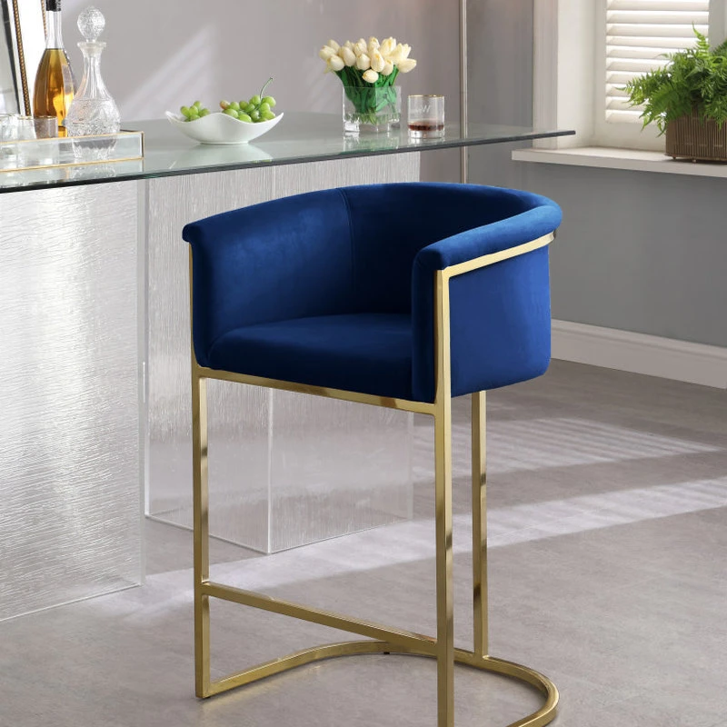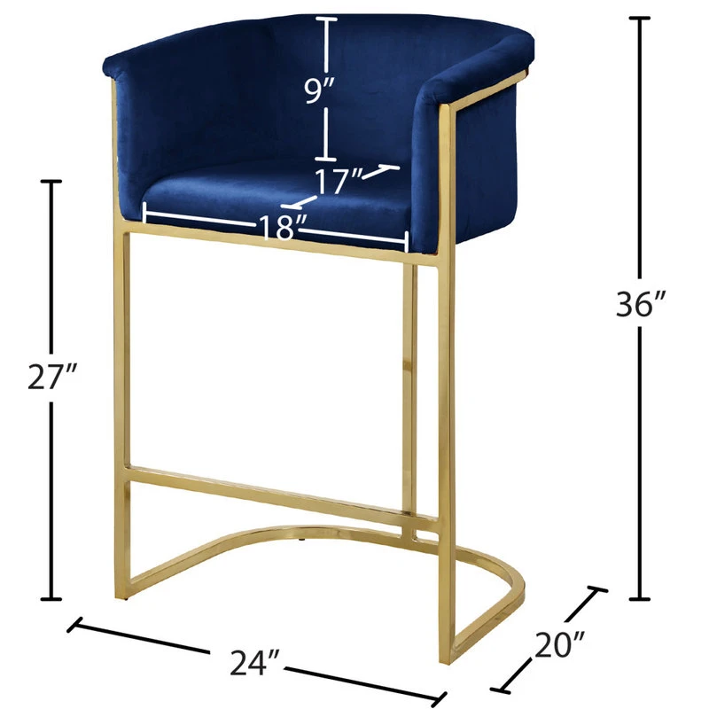 Complement your contemporary home furnishing with this Donatella Navy Velvet Stool from Meridian Furniture. Its curved design and rich beige velvet upholstery provides a comfortable, soft, luxurious seat for you to relax in, while also adding a touch of elegance to your living space. Its gold steel base adds the perfect balance to the stool’s fun navy color, in addition to holding the stool up to counter height and providing durable support for years to come.