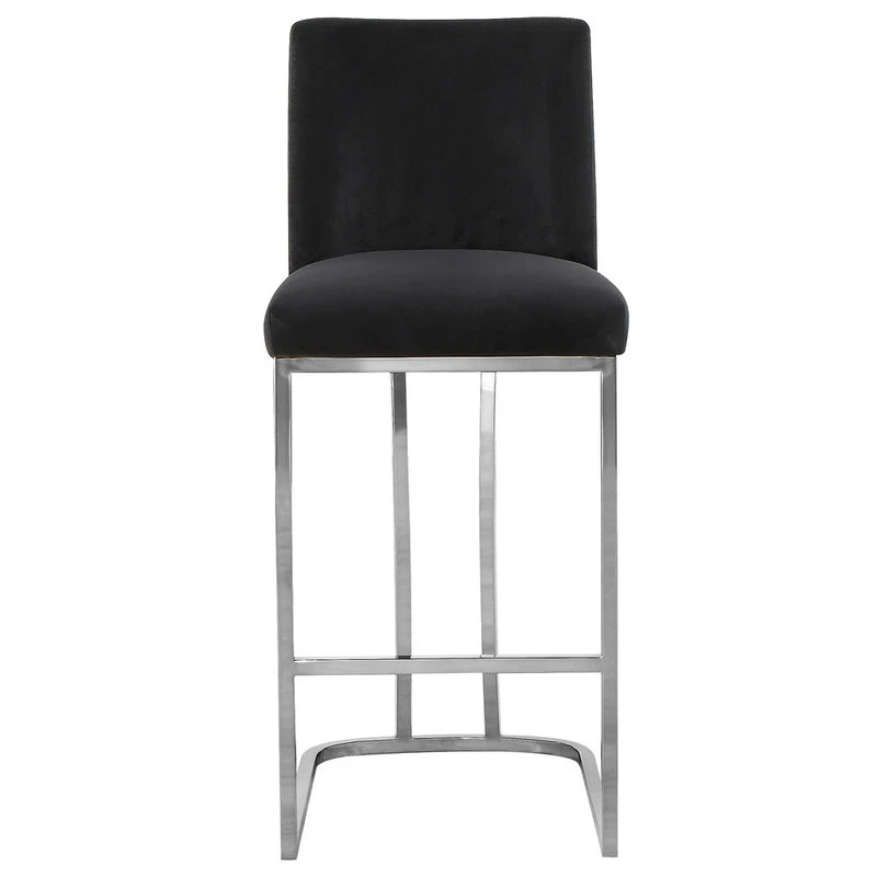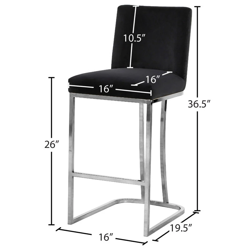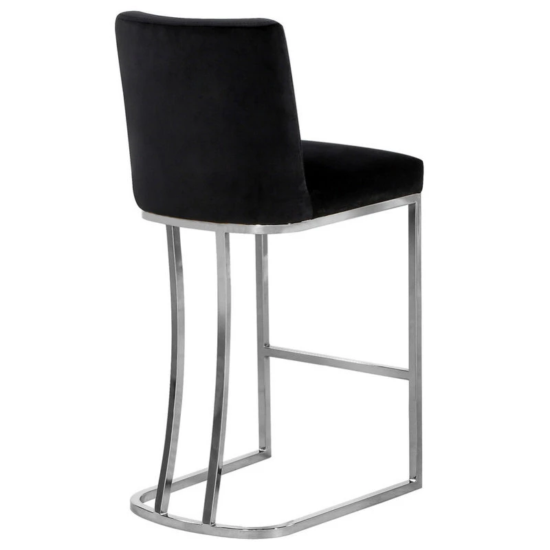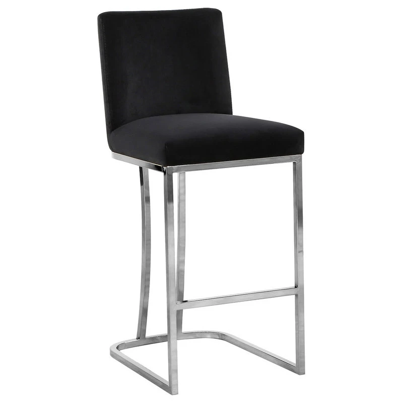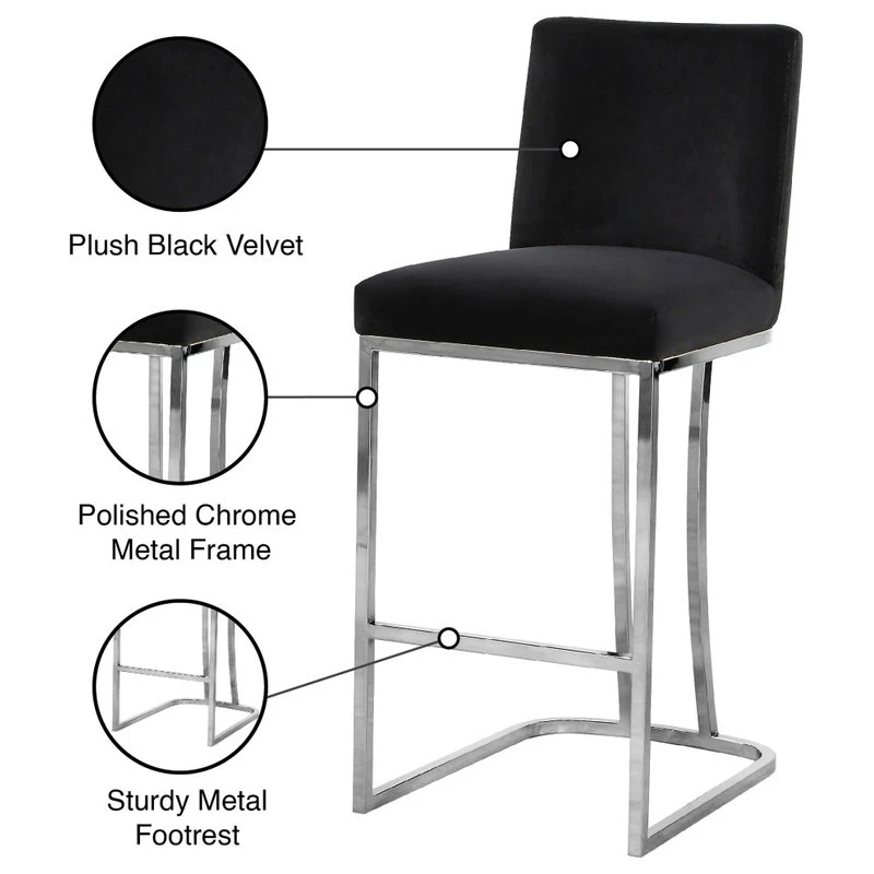 Make sure guests stay comfortable as they wine and dine from this Heidi Black Velvet Stool. This stool has a sleek metal base finished in chrome for a chic look and is upholstered in sumptuous black velvet for a touch of glam. The upholstery is top quality and has a sleek, velvety feel against the skin for a refined and elegant presentation. The armless design facilitates conversation, and a footrail on the bottom gives you a spot to rest your feet while you dine.