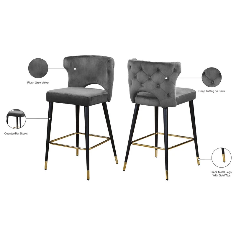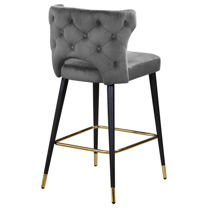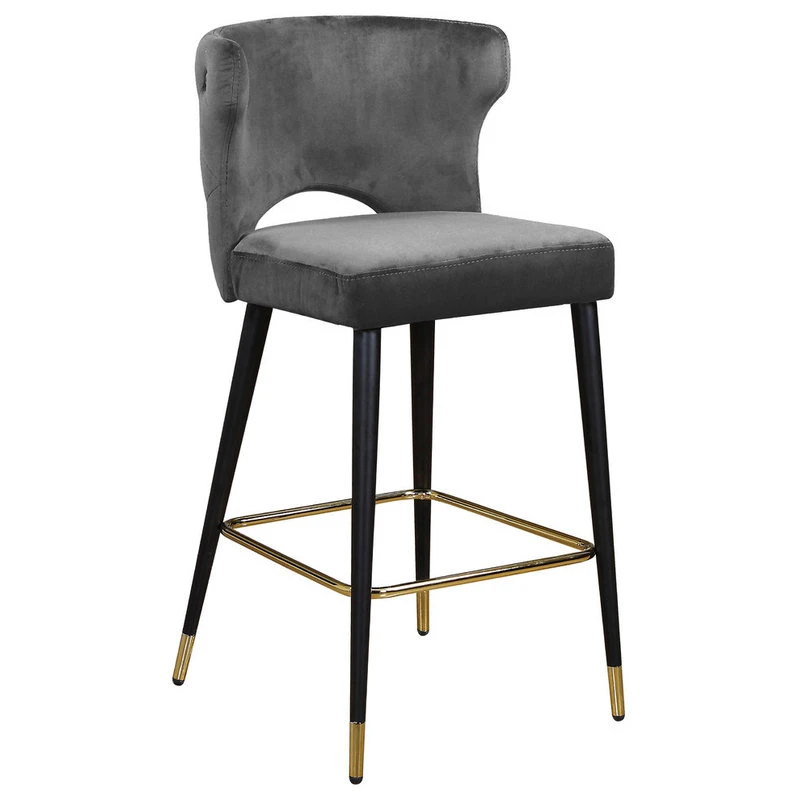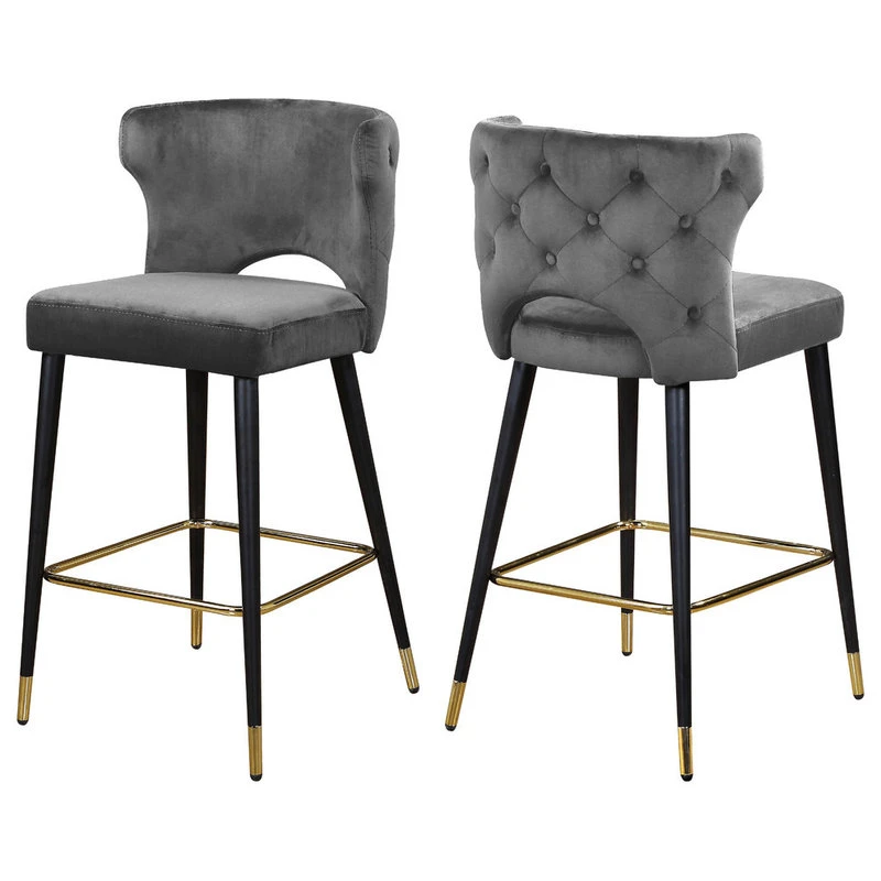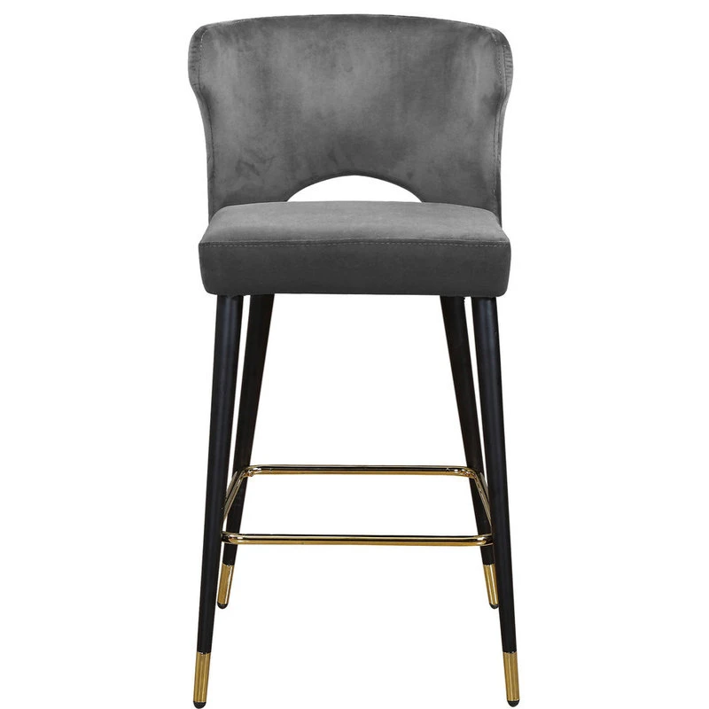 Sit comfortably on this Kelly Grey Velvet Stool. The back and seat cushions are plumply stuffed for enhanced comfort and covered in rich velvet upholstery to give your room a burst of color and jewel-toned fun. This stool has black metal legs with gold tips for added contemporary panache, and it’s built strong and tough, so it stands up to heavy daily use without breaking a sweat. These stools can outfit any bar or kitchen counter area.