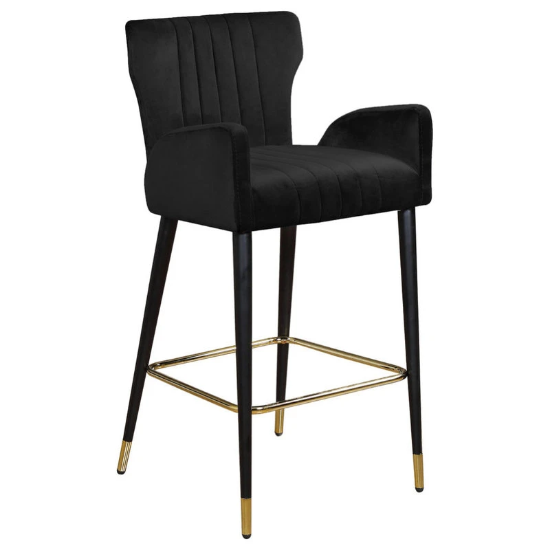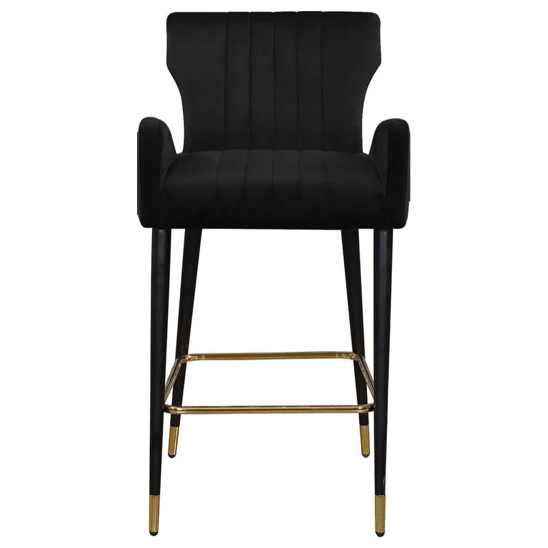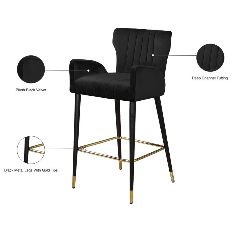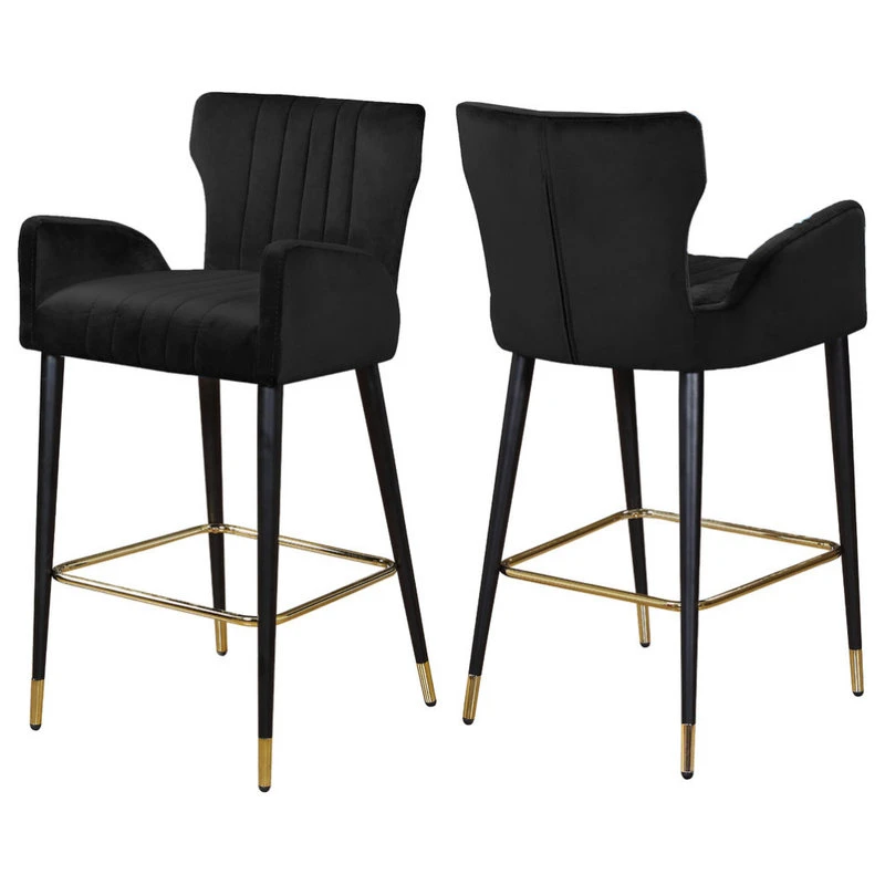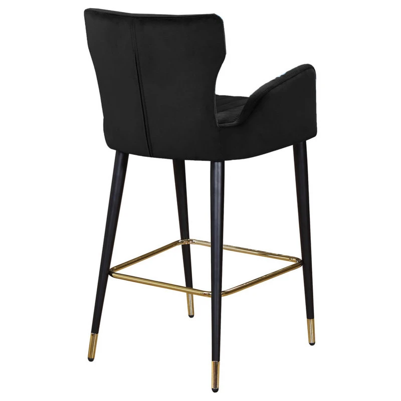 Inject beautiful color into your counter or home bar area with the Luxe Black Velvet Stool. Flared sides and a semi-high back provide support while you sit, so you stay comfortable for the whole meal. Channel tufting on the seat and back adds a dimensional effect while helping the padded cushions keep their loft and form. The metal legs are given a black finish for a contemporary look and goldtone hardware tips for a regal finish.