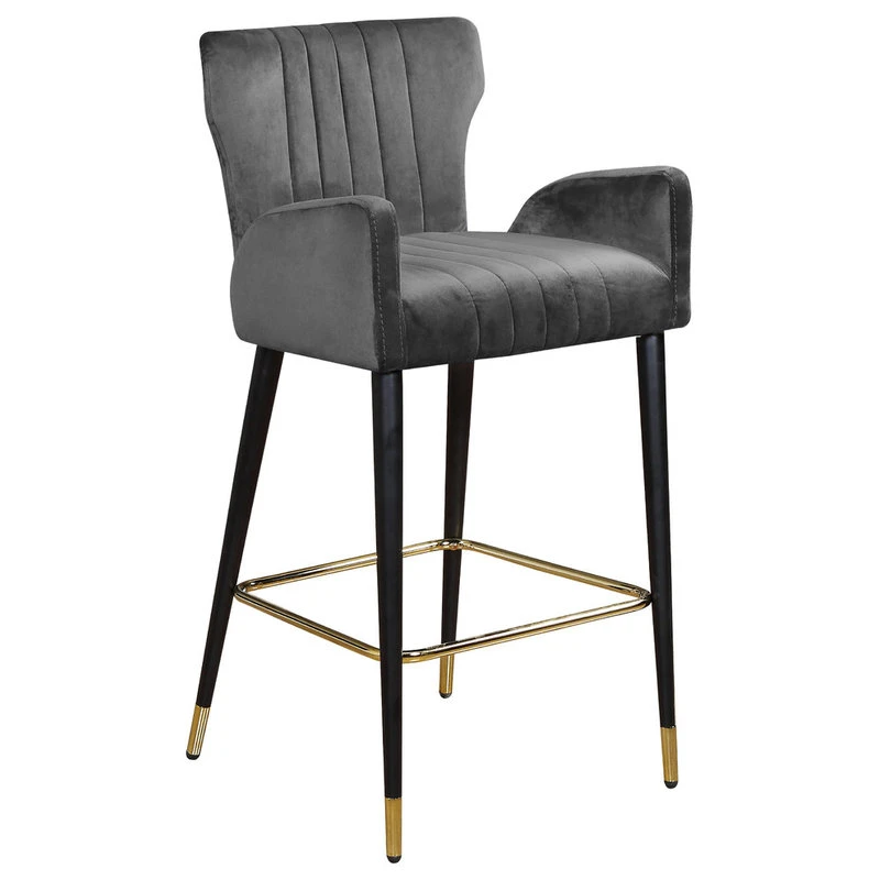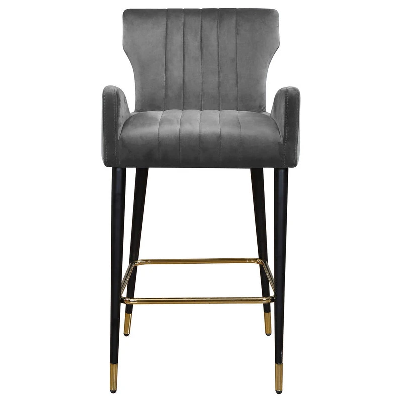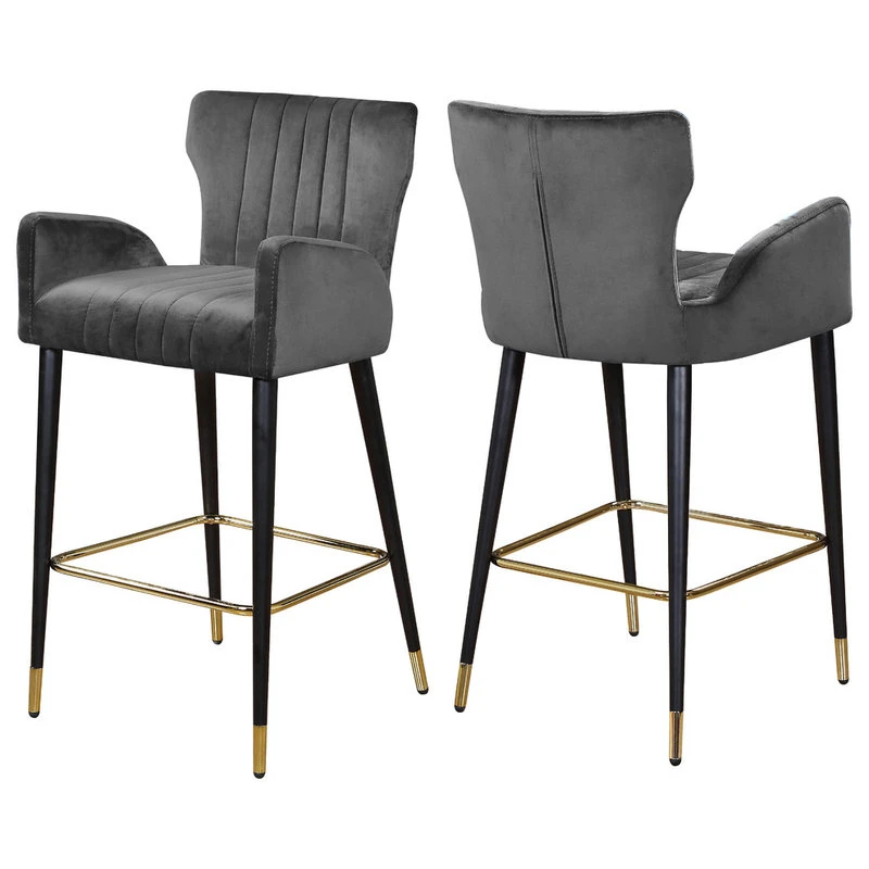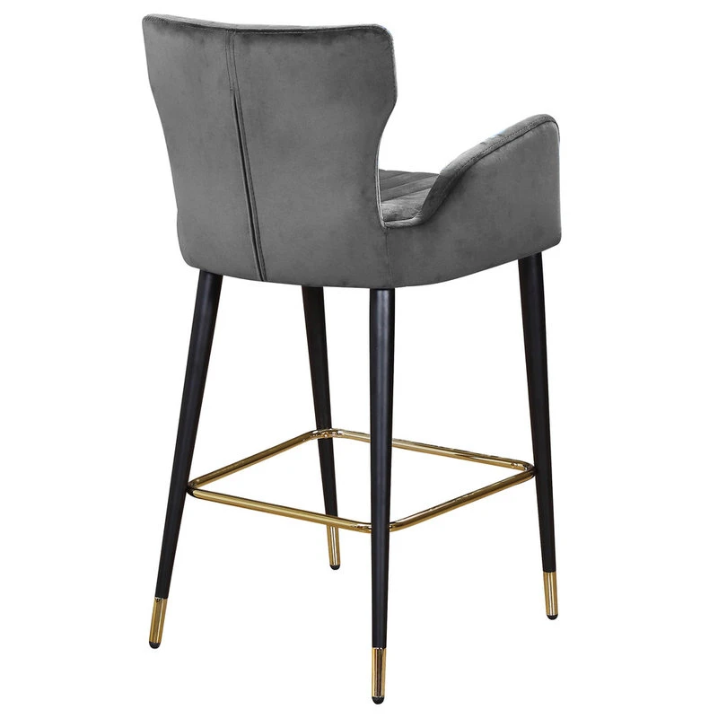 Inject beautiful color into your counter or home bar area with the Luxe Grey Velvet Stool. Flared sides and a semi-high back provide support while you sit, so you stay comfortable for the whole meal. Channel tufting on the seat and back adds a dimensional effect while helping the padded cushions keep their loft and form. The metal legs are given a black finish for a contemporary look and goldtone hardware tips for a regal finish.