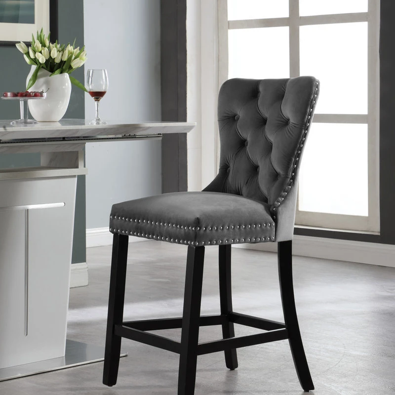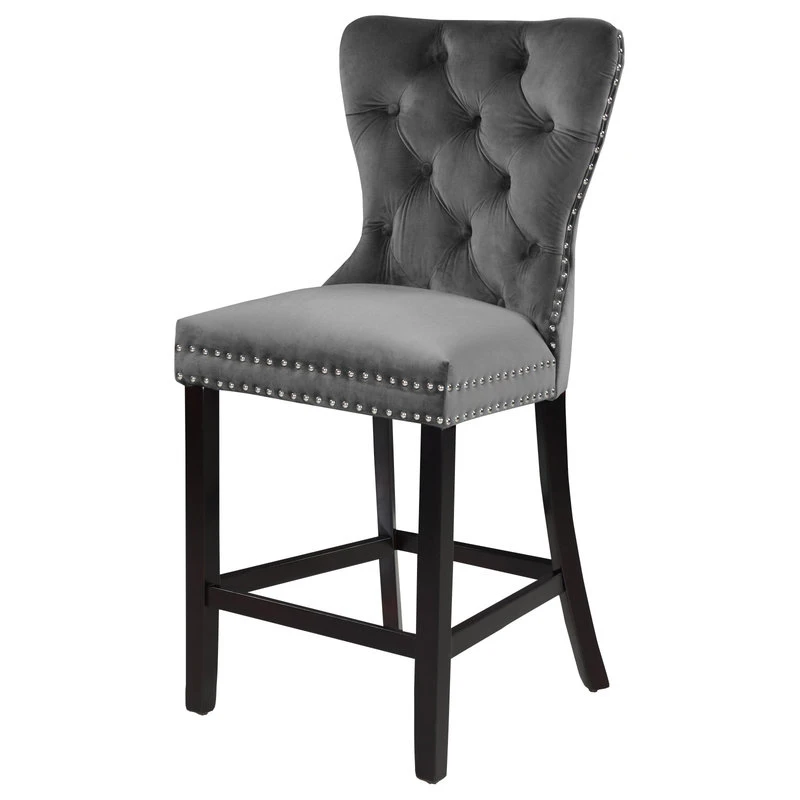 Lounge in luxurious style with the Nikki gray velvet counter stool. Featuring a curved high back, plush cushioned seat and deep tufted gray velvet upholstery studded with chrome nailheads, this counter stool is sure to take your dining experience to a whole new level. Espresso wood legs provide sturdy support and complement the stunning grey upholstery for a sleek, contemporary design.