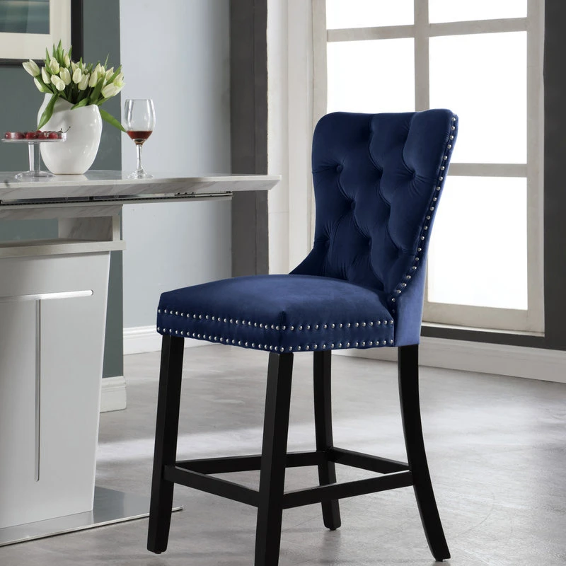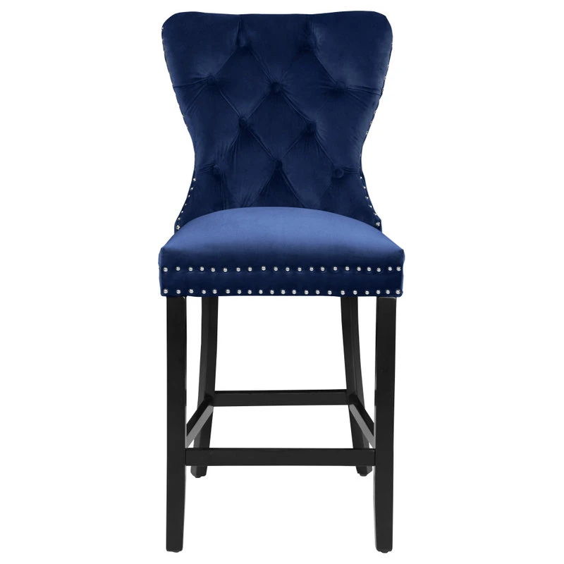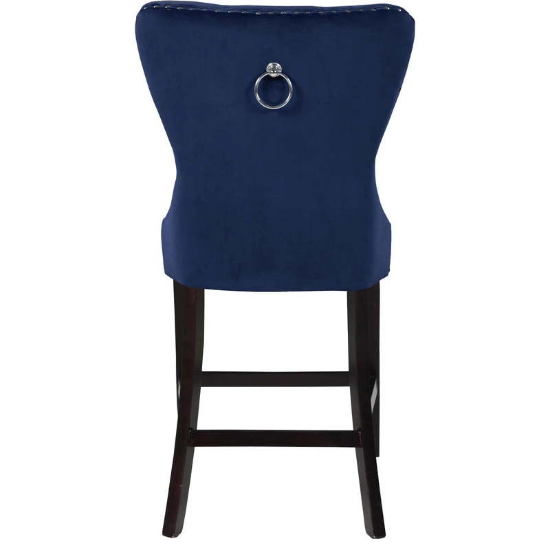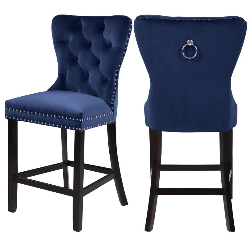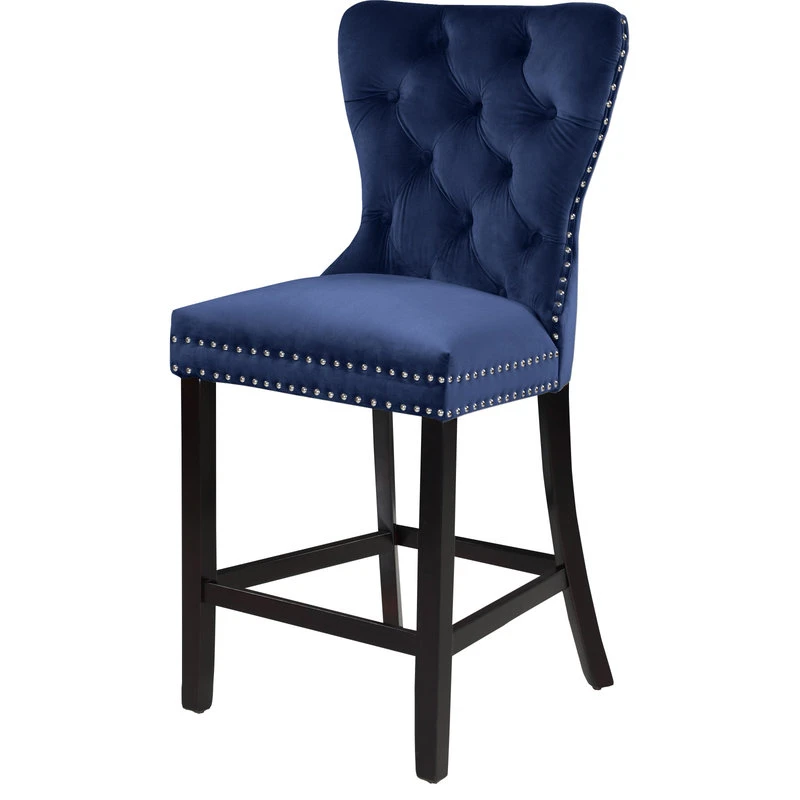 Lounge in luxurious style with the Nikki navy velvet counter stool. Featuring a curved high back, plush cushioned seat and deep tufted navy velvet upholstery studded with chrome nailheads, this counter stool is sure to take your dining experience to a whole new level. Espresso wood legs provide sturdy support and complement the stunning navy upholstery for a sleek, contemporary design.