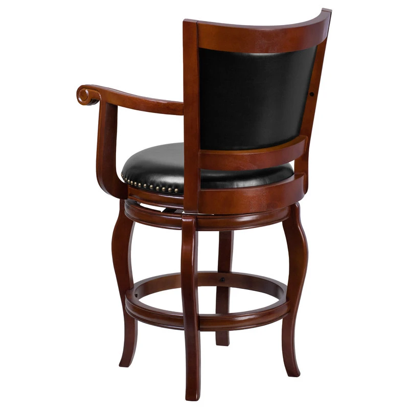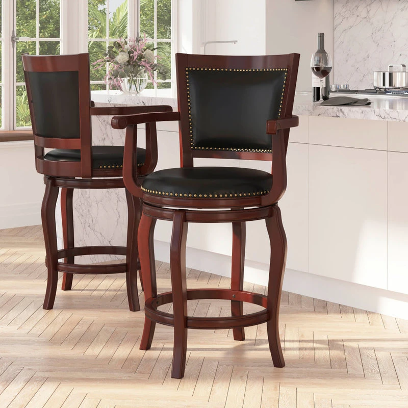 Elegant style and modern comfort come together in this wooden counter height stool. The sturdy wooden frame features curved arms, a panel back with faux leather accented back and an integrated footring for added comfort. The faux leather swivel seat is comfortably padded and adorned with nailhead accent trim. Plastic floor glides provide smooth movement and protect your floors from damage.