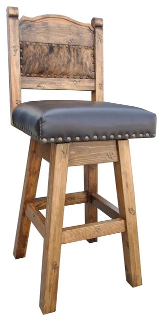 This beautiful western style bar stool is handcrafted with kiln-dried solid wood, double doweled at joints, upholstered with premium top grade dark brown leather on seat and Brindle Brazilian cowhide on back. Finish in Walnut Wormwood Distressed stain, cover with sealer and lacquer for extra protection. Heavy duty swivel mechanism.