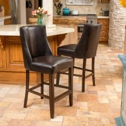 GDFStudio GDF Studio Rydel Nailhead Accent Brown Leather Stools, Set Of 2, Counter Height