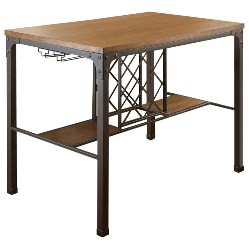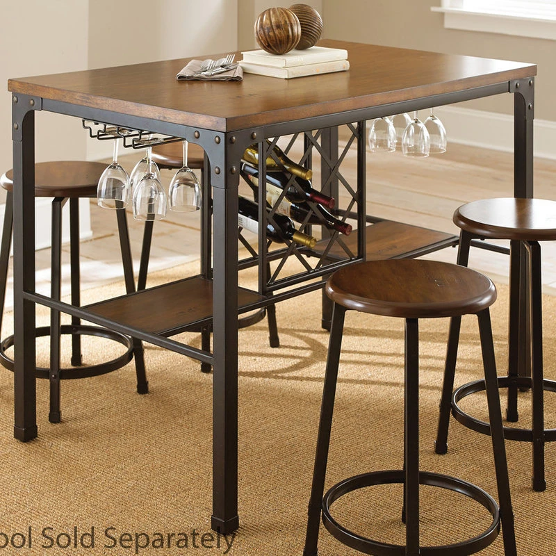 The Rebecca collection has a utilitarian industrial look in metal and wood, with high functionality for small spaces. The mixed-media counter table features a metal frame with a weathered catalpa veneer table top and shelves. Built-in under-the-table storage space includes wine storage and wine glass holders. The 24″ high counter stools are simply designed, with weathered catalpa veneer seats.Features: