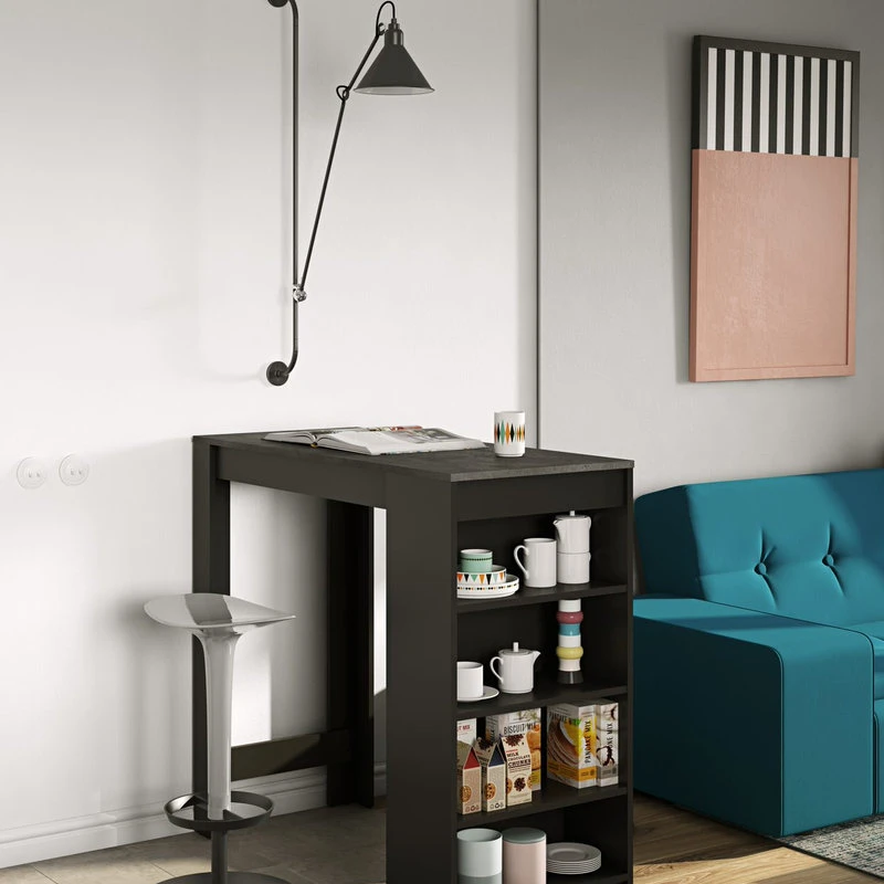 The Aravis contemporary dining bar table is extremely functional. Perfect for small spaces, this table features side storage shelving and can accommodate up to four bar stools.