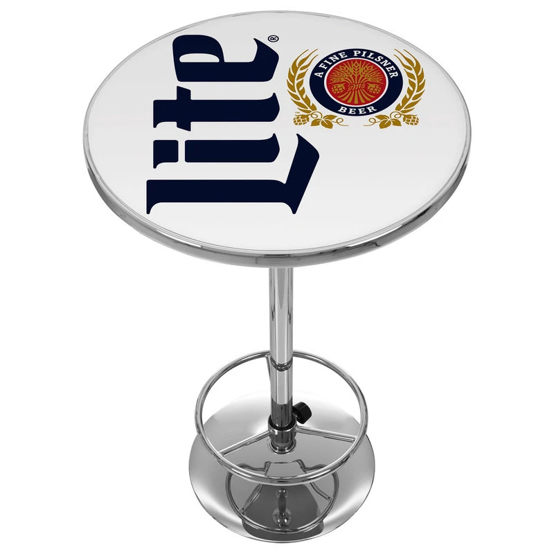 Impress your guests with your officially licensed chrome pub table. This fully functional pub table will be a stylish accent to your game room, garage or collection. The table top features an authentic logo trimmed with chrome finished plastic banding and is supported by a chrome base. The chrome base is both lightweight and durable. It features an adjustable foot rest for customizable comfort. Bring style, function and comfort to your game room, garage or collection with an officially licensed chrome pub table.