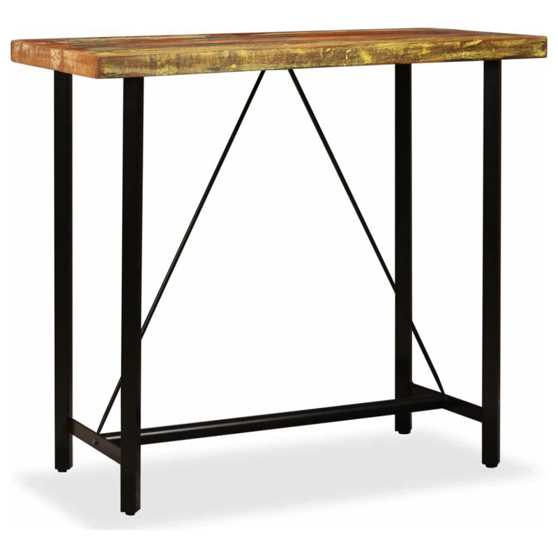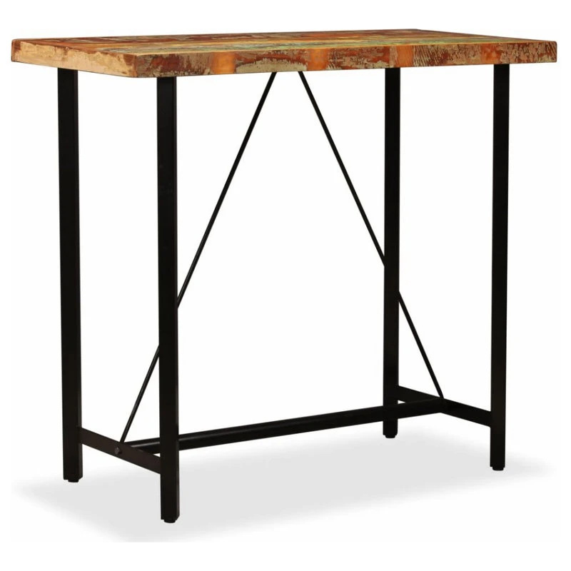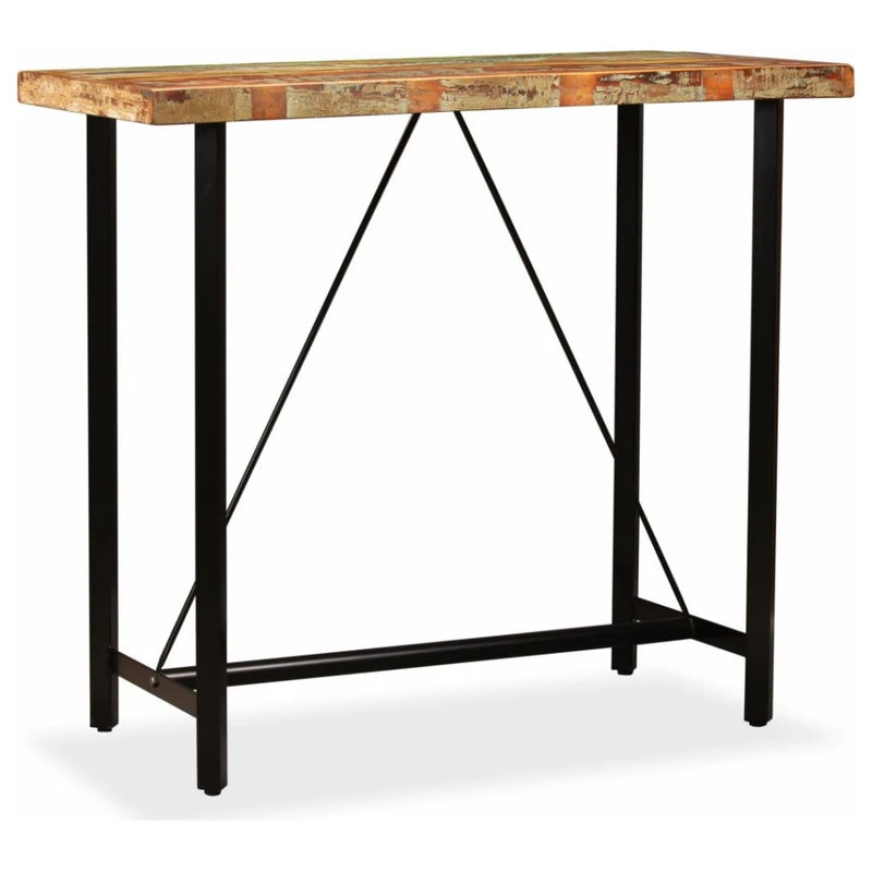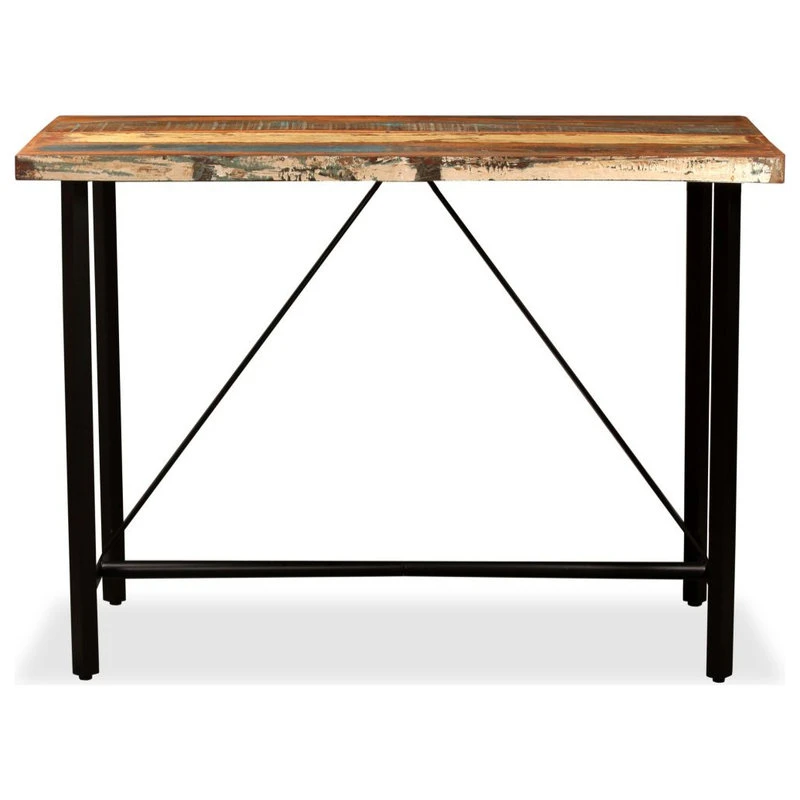 This cool wooden bar table has an industrial look and will make a distinctive addition to your dining room and kitchen. The bar table is made of solid reclaimed wood, which means that it has the characteristics of different woods like teak, mango wood, acacia, etc. Reclaimed wood is solid, stable, durable and beautiful. Signs of wear give each piece a unique look and the steel structure adds to its spectacular industrial style. Every step of the construction process is carried out with the greatest care, be it recombining, polishing, painting or lacquering. Assembly is easy. Important note: The color and wood grains may vary from piece to piece, making each piece unique and slightly different from the next; the delivery is random.