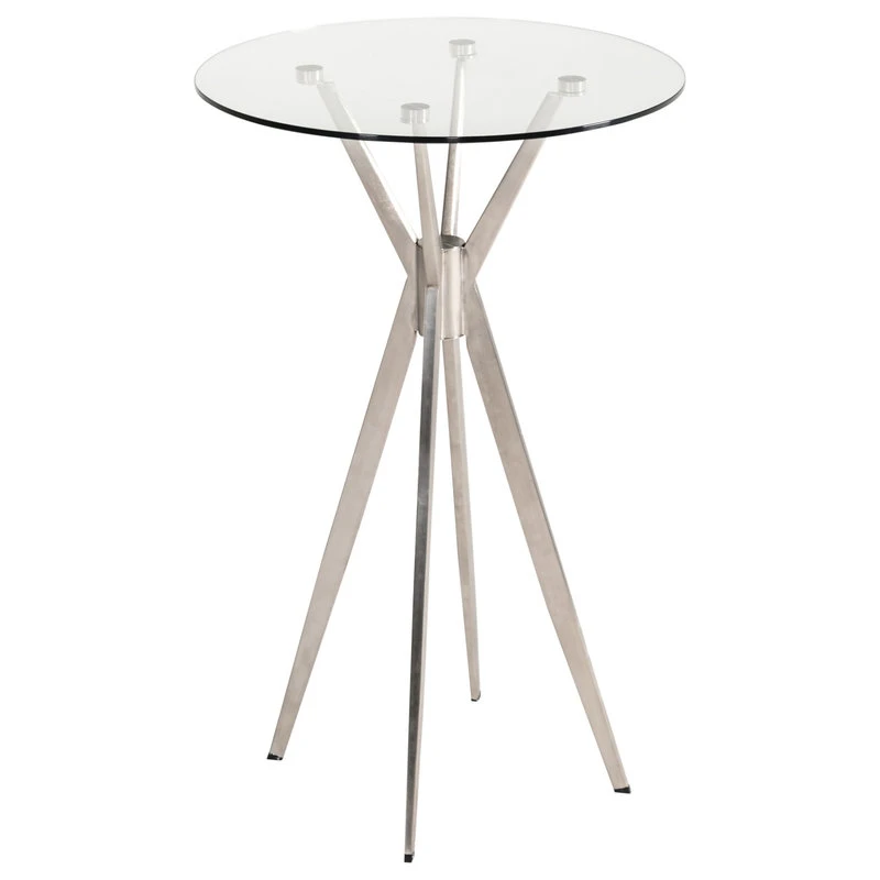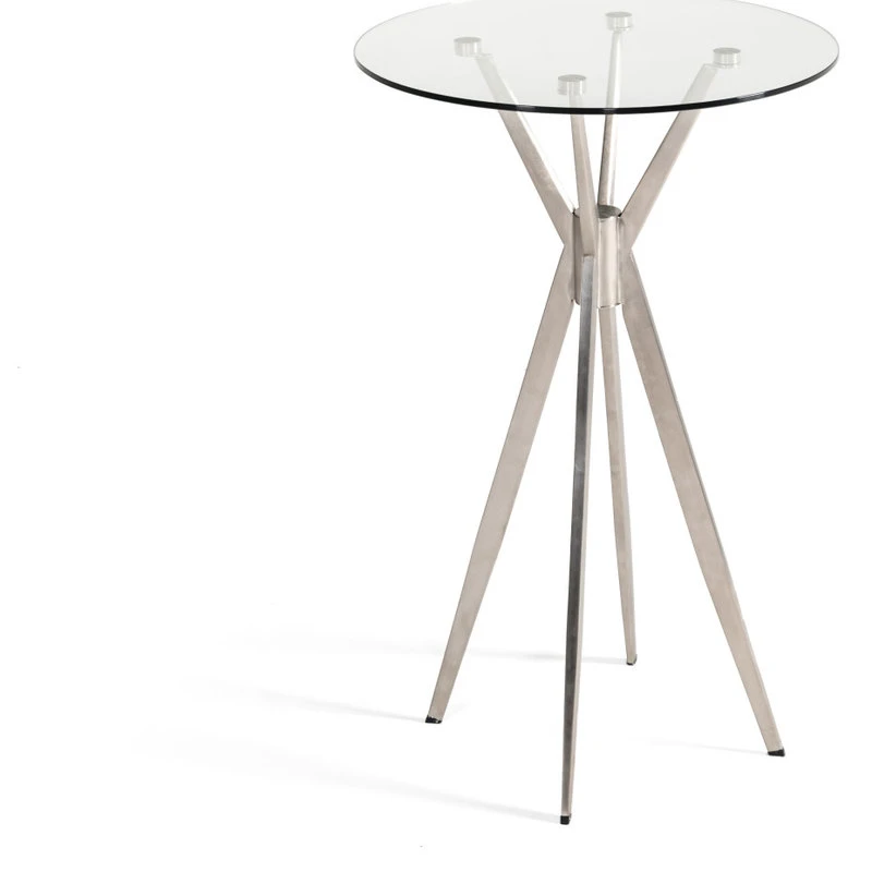 The Kaitlyn bar table features a 10mm clear round tempered glass top, with brushed Stainless Steel legs, and a brush stainless steel cylinder thst supports the legs where they intersect.