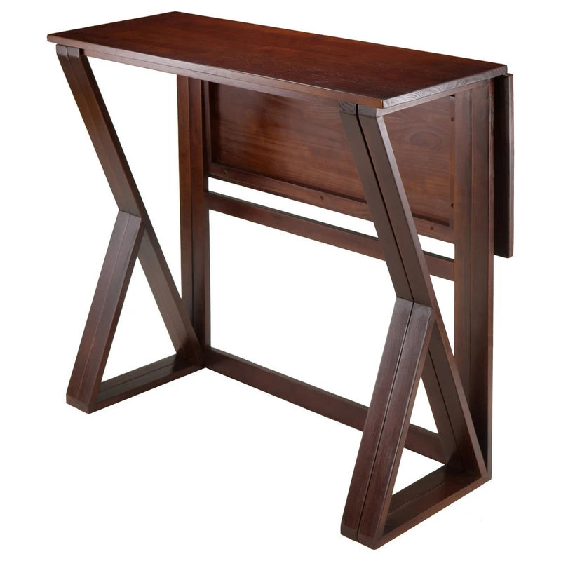 Harrington Drop Leaf High Table is a unique space saving kitchen table. Table features a drop leaf extension and is supported by gate leg. Table can be used in kitchen or extra table around the house. Add stools to table to enjoy your meal or work. Table features a drop leaf extension with a surface area of 39.37″W x 15.75″D. Table dimension when the drop leaf is down is 39.37″W x 16.59″D x 36.22″H. Fully extended table size is 39.37″W x 31.50″D x 36.22″H. Constructed from solid wood in warm Walnut Finish. Assembly Required.
