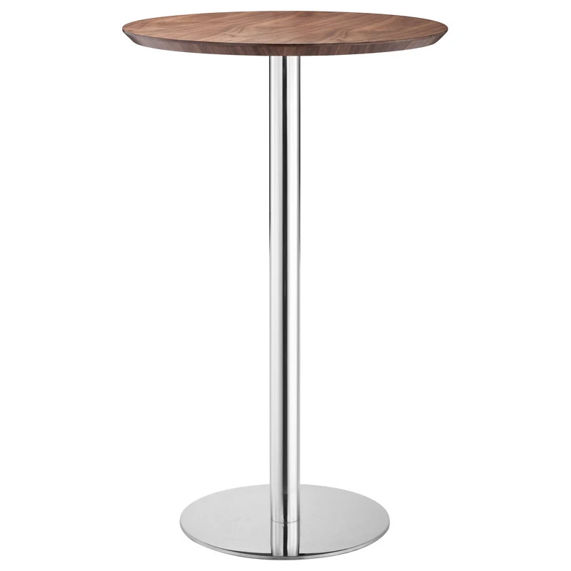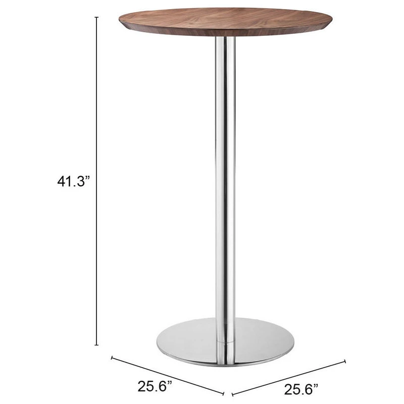 The Bergen Bar Table is a symphony of simplicity. Boasts a walnut finish and gleaming chrome base. Elegant planning adds craftsmanship.